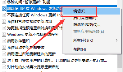 6、然后右键选中“删除使用所有Windows更新功能的访问权限”,点击“编辑”。