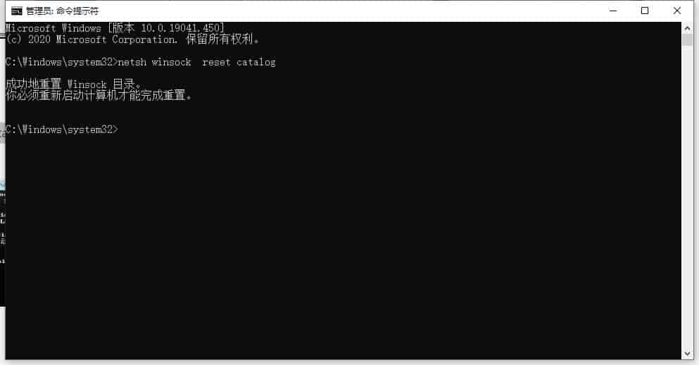 3、接着在弹出的操作界面中输入“netsh winsock reset catalog”,按下回车确定。