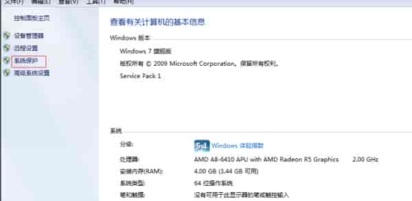 2、在计算机属性中,左上面找到“系统保护”,鼠标左键点击“系统保护”。