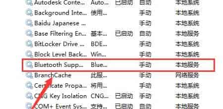 2、在弹出窗口中找到“Bluetooth Support Service”,右键选择“属性”。