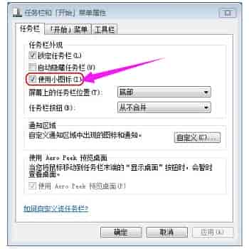 5、然后右键开始,在任务栏中勾选“使用小图标”。