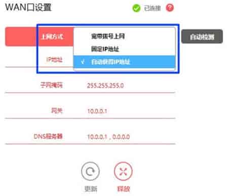 6、检查一下你的上网方式,路由器有“联网方式、连接类型、wan口连接类型”,