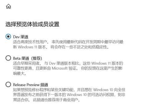 6、接着在选择预览体验成员设置下选择“Dev”或是“Beta”渠道。