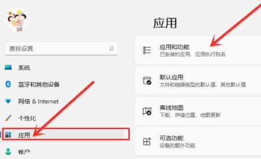 2、接着在设置面板中选择“应用”并进入“应用和功能”