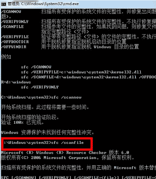 6、输入“sfc /scanfile”并按下回车(Enter)还可以对系统参考文件进行扫描和修复。