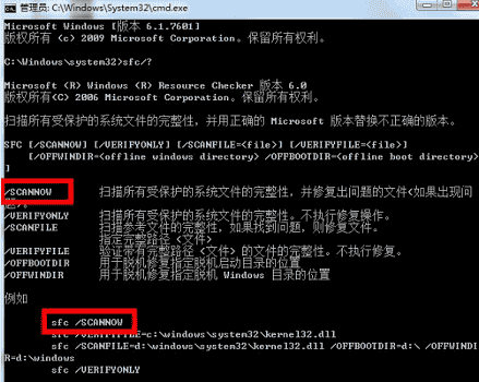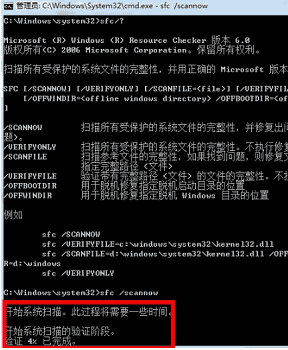 3、在指示处输入“sfc/?”,会自动提示所有修复方式。