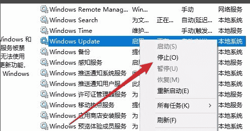 然后右键点击该服务项,在弹出菜单中选择“停止”菜单项。