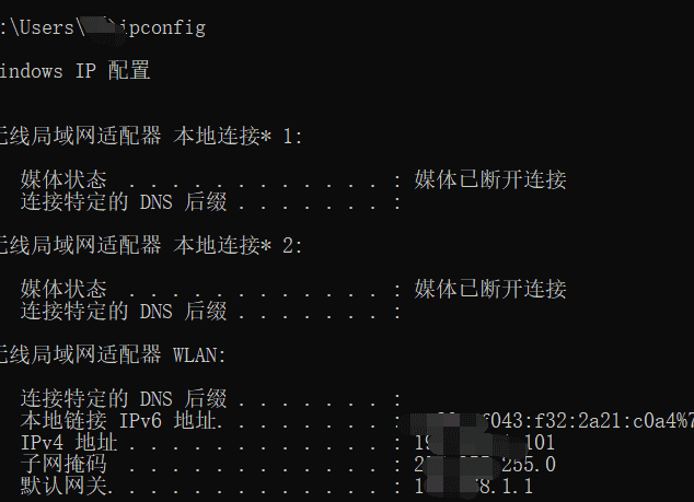 2、打开【命令提示符】之后,在光标处输入【ipconfig】,单击enter键,就会出现一系列的看着类似IP地址的数字和符号,IP4地址那行后面的那些数字就是这台电脑的IP地址;