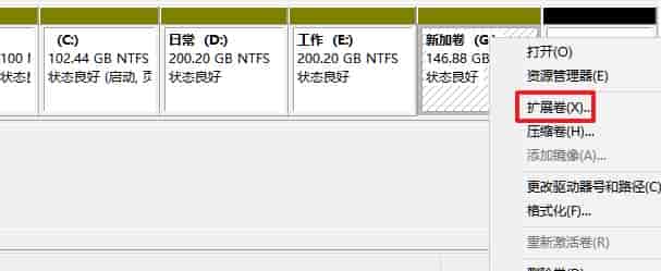 5、对于还未分配的空间,也能选择它并进行分区,在选中的分区上右击,选择“扩展卷”即可。