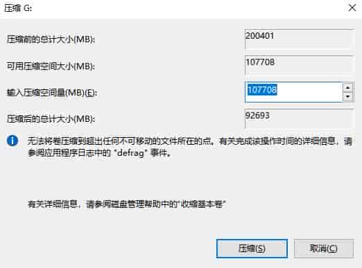 3、输入希望分出空间大小要注意至少留下50GB的容量,确定容量后,点击“压缩”即可。