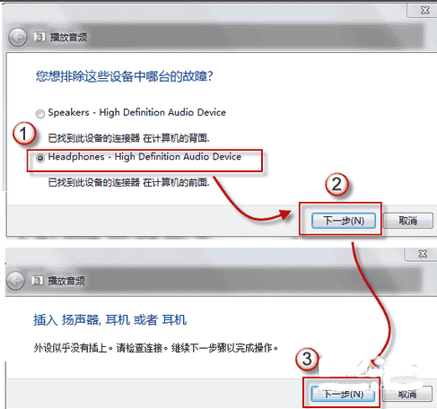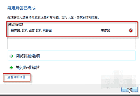 4、此时,如果插入耳机或扬声器,并点击下一步按钮,系统会自动更改修复,并给处如下对话框