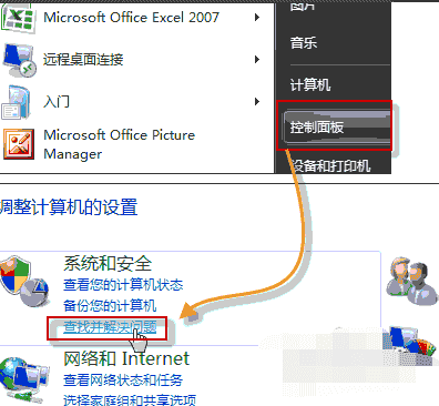 1、打开开始菜单,控制面板;在系统和安全中,选查找并解决问题