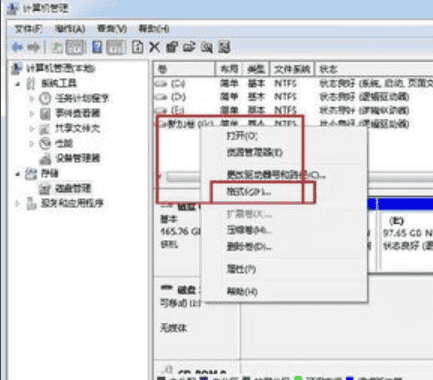 3、右键需要格式化的磁盘,从弹出的菜单中选择格式化。