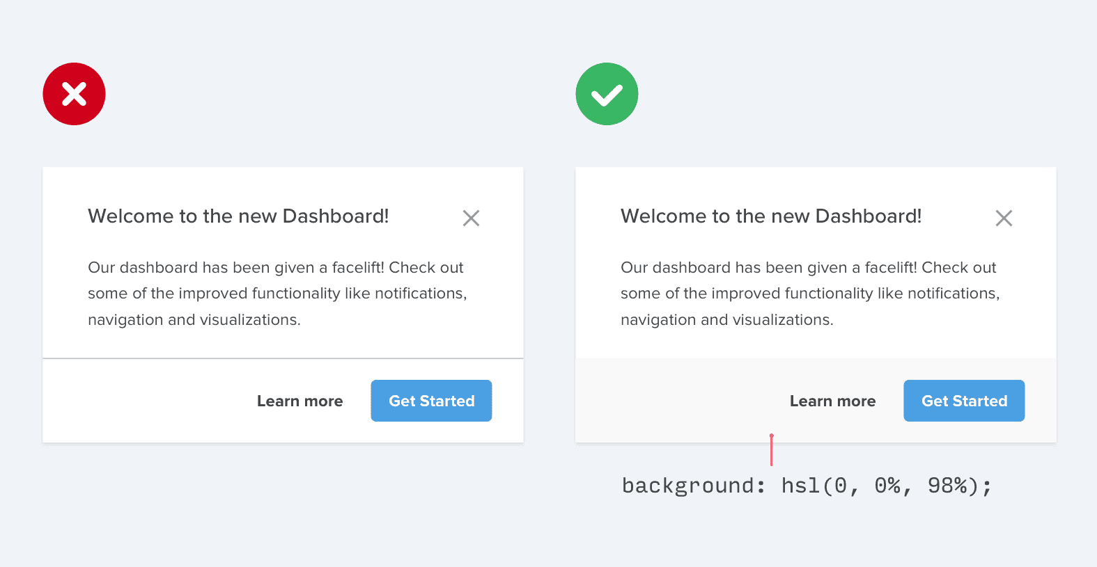 通常,相邻的元素背景只需要有微妙的差别就能够让人对他们进行区分。所以,你所需要做的就是在不同的区块采用不同的背景色,并且尝试删除边框,因为你根本不需要它。