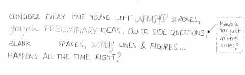 考虑每次你留下未完成的招灰色的想法,顶固的形状,快速一侧查询,空格,摇摇晃晃的线条和数字。一切发生的时间,对不对?的这些indeterminacies,或“瑕疵”,这反映了我们的优柔寡断,是伟大的新的设计方向的指针。我们失去了这些,当我们选择像素完美。