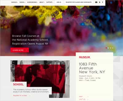 美国国家科学院博物馆 这种布局有一个分层的感觉,表现出一种模块化的方法。不同页面上的元素似乎相互重叠,例如,在导航栏约四分之三的方式在页面上停止。照片位于下方的导航按钮和标题都写在加入的模块化分层审美的彩色块,。我也很喜欢下拉阴影效果,在下拉菜单中的导航,它创建了一个有趣的深度。