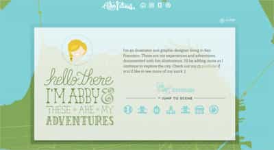 艾比Putinski 组合现场的原始的方法,艾比Putinski的正副自己作为一个创造性的插画家和平面设计师。在加载时,动画的介绍窗口落在邀请用户去探索她的作品搬上银幕。一旦你关闭该窗口,你走动的地图编译所有她的冒险。本网站不真的有一个布局,是免费开放的,没有明确的区域界线,使得它这么有趣的导航。当你点击一个工作,在一张明信片式车架形象下降到页面上,重申冒险和旅行的想法。导航是始终可用的和固定的顶部在同一个系列,美育。