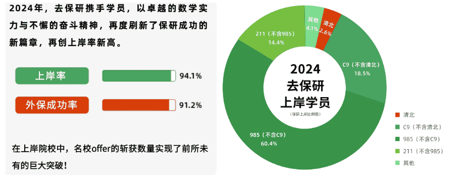 在2024年的保研征程中,凭借着专业的指导和全方位的服务,高顿去保研助力4000+学子成功上岸。上岸率高达94.1%,外保成功率高达91.2%,清北offer的比例为14.4%,C9院校(不含清北)offer的比例为18.5%,985院校(不含C9)offer的比例为60.4%。