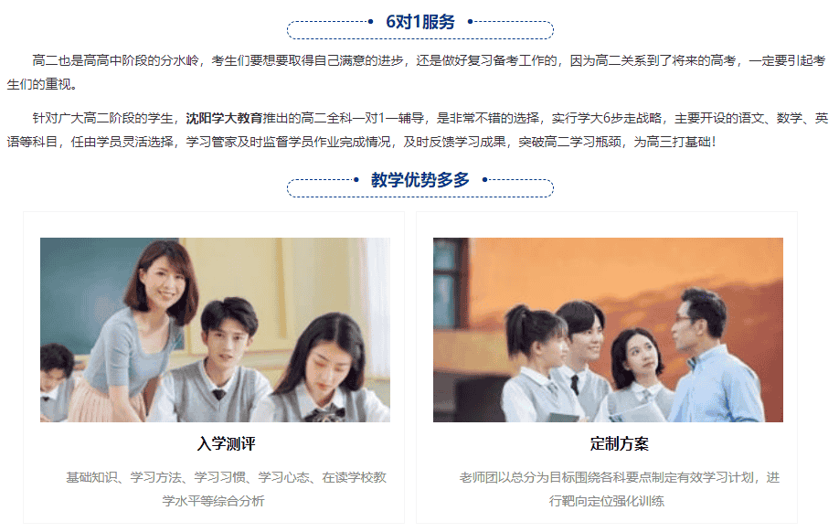 针对高二阶段的学生,倾力推出了高二全科一对一特训课程,精细化课程设置,学员的学习效果,全程实行入学评测,定制教学方案,哪里不会补习哪里。沈阳高中名老师亲临,高二语文、英语、数学等科目精讲,攻克高二各科难关,实现高二科目的优化学习!