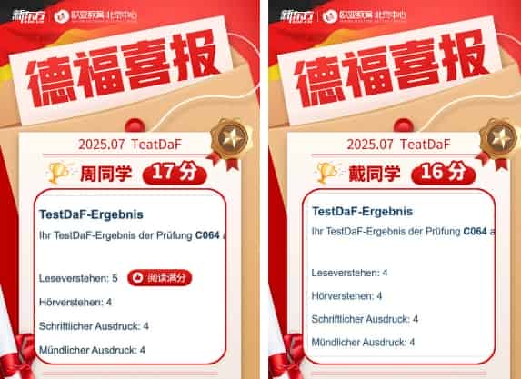 如果你也正在备战德福,或计划赴德留学,不妨抓住暑假的尾巴,加入北京新东方德语9月德福备考班级,让专业的老师带你系统备考,一起向梦想迈进!