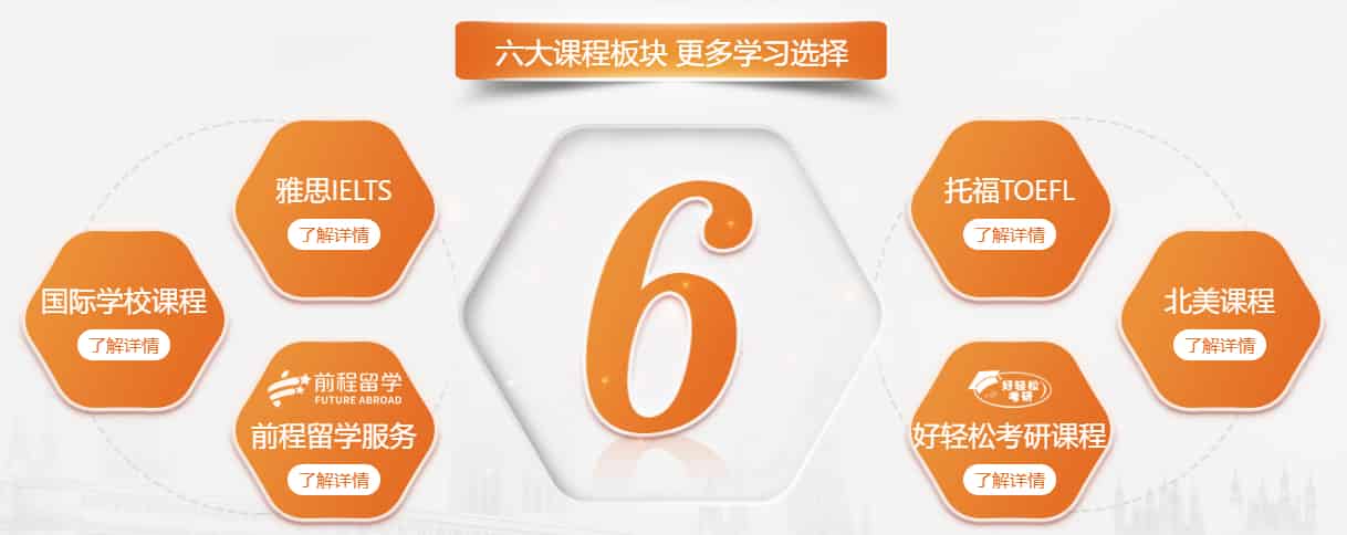 课程名称 招生对象 小时 托福精讲100分班+GRE320分班 词汇量3500左右的同学、有志于进入美国大学研究生深造 205小时 托福强化100分班+GRE320分班 词汇量3500左右的同学、有志于进入美国大学研究生深造 133小时 GRE320分班 通过大学六级或托福已经有85分以上的学生 61小时 托福精讲100分班+GMAT强化710分班 有志于通过托福、GMAT考试,进行研究生深造的学生 215小时 托福强化100分班+GMAT强化710分班 有一定英语基础,希望学习做题应试方法,提高做题实战能力的学员 143小时 GMAT强化班 有一定的英语基础、有志于进入美国大学研究生深造的学生 71小时 -