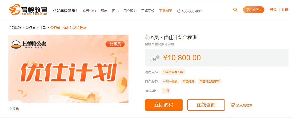 定价为10800元,有效期长达18个月,提供选岗指导、学习规划、考前提醒等一站式服务。
