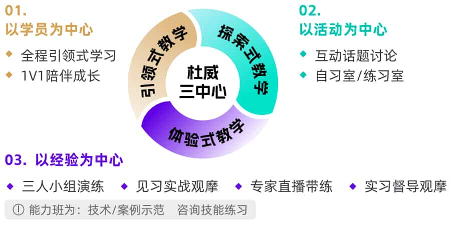 以教育家杜威三中心理论为基础,研发出适合学员全面发展且增加学习效果 的三位一体全新教学模式,跟踪学习体验