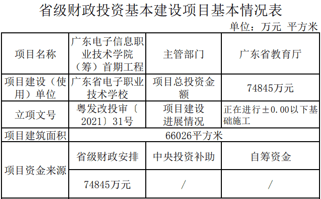 2024年11月20日,广东电子信息职业技术学院(筹)首期工程开工仪式在广州市天河区顺利举行。首期工程总建筑面积为6.60万㎡,施工总工期为590日历天,建安工程包括教学楼、实训楼、教学行政楼、活动中心、图书馆、学生宿舍及食堂、后勤及附属用房、室外运动场地、机动车位、地下室、架空层等。项目的建成有助于广东电子信息职业技术学院(筹)优化高等职业教育生源及培养结构,建设高水平职业教育。