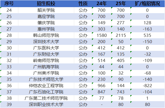 从上图来看,只有惠州学院、韩山师范学院、广东第二技术师范学院是扩招的,其余的院校招生计划保持不变或缩减。深圳职业技术大学为2025年新增的招生院校,只招收护理专业,且有专业限制。