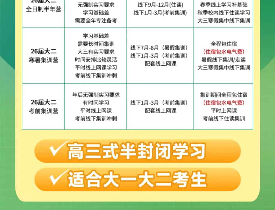 1. 半年集训营:适合大三没有实习任务,渴望沉浸式备考,基础欠佳且自学能力较弱的学生。每年 9 月开课,长达 190 天,进行全日制封闭学习 。