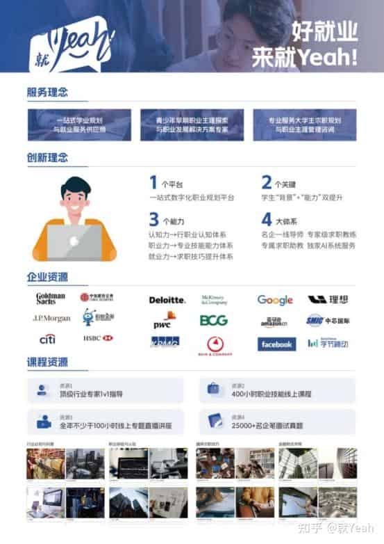 - 一站式求职规划平台【就Yeah】,专为在校生、应届毕业生以及归国就业的留学生提供一站式职业规划解决方案,致力于帮助学生实现职业梦想。