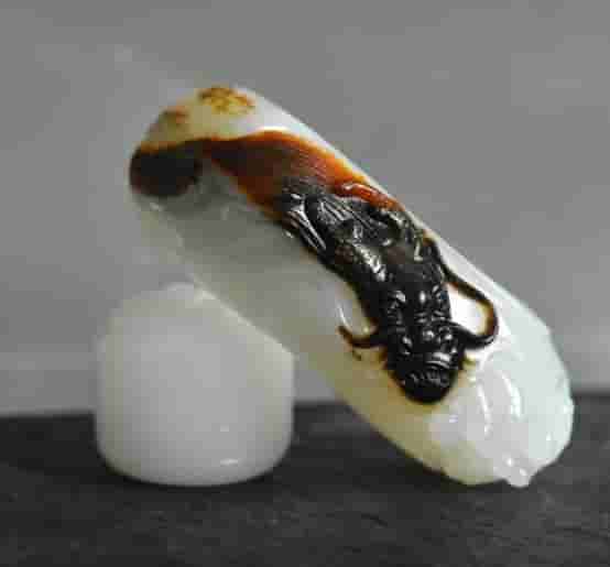 当籽料卖,能卖出更高的价格,更丰厚的利润;俄料名声较差,东西也难卖一些(因为玉质出色,它的价很贵哦)!它的皮色,可谓是有利也有弊,正如上文所说的,因为俄黑皮料几乎都是类似籽料的一层黑皮,所以有人就会把它冒充籽料;但也因为这层皮色,给了玉雕师无限想象空间进行俏色雕刻,当然啦,要利用这个黑色,并不是人人都能做到的,毕竟在黑色下面,往往都伴随着脏、杂、僵等不利因素,如果处理的不好,很容易就画虎不成反类犬了。下面就是黑皮的巧雕佳作欣赏!