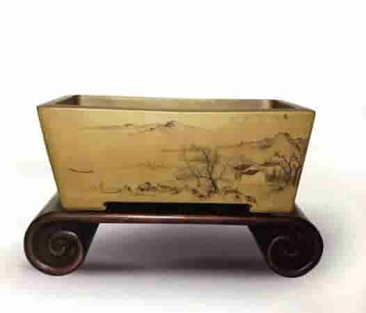 纵观世界盆景界,日本配盆是最讲究的,如国风展参展的盆景,很多高级的古渡盆都在用。如果自家没有合适的花盆来种盆景,日本还有一个产业,就是出租古盆。出租前有很详细的规定,如果树在展览中得奖的话,要加钱如果盆破损需赔偿相应损失。还有在盆景园中,放盆景的场地用的都是木板,这样花盆的脚不容易损坏。近年日本经济不好,很多古盆回流中国。但实用盆和比例好的盆,包括几架一般日本人不卖,收租金比卖给我们要合算。