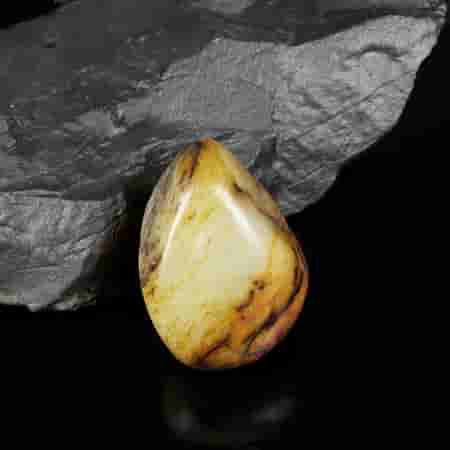 除了这俩主爹外,和田玉还有不少“野爹”,当带有石墨的“野爹”参与了一些不可告人的活动后,他的肤色会白里带黑、青里带黑、绿里带黑。这个爹参与的多就直接改变血统叫墨玉,参与的少就叫青花。这个爹通常很坏,也有好的时候,参与的恰到好处则会给和田玉水墨山水的外表。“野爹2”从来不找Cr爹的麻烦,但是对FeO爹痛下毒手,常常把他变黄。他们基因里带有Ti和Mn。有其参与就形成黄玉,黄口等。还有一“野爹3”也非常猛,他是变异产物。同样有铁,他是针铁矿。针铁矿多了就会给和田玉从浅黄到深黄的色泽。如果还有金红石参与参与,就会形成美美的红褐色。这就是我们说的糖料。这就是和田玉主要的几个爹,其他还有把他搞紫的爹,搞成翠绿的爹就先不介绍了。