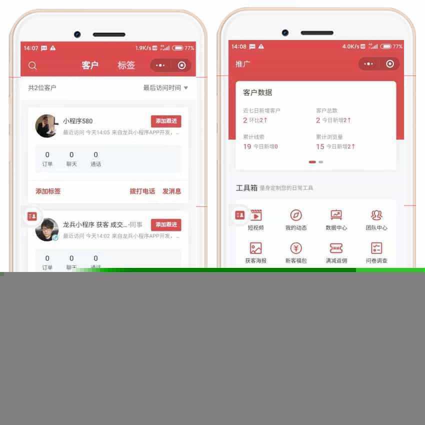 龙兵装企获客小程序,基于《龙兵智能名片》研发近5年,迭代近150个版本,800+代理商反馈更新的基础上,沟通了30家装修公司后,针对装修企业的痛点,专门研发这款装企营销系统。《龙兵装企获客系统》3大创新优势以员工为中心,赋能员工引流成交的营销利器(营销要落地,必须有工具,员工不执行,一切都归0)一切好的营销方案和工具,要落地,要有效果,都必须依靠员工的执行,如果不能帮助员工解决拓新客、促成交、提复购、转介绍的问题,不能帮助员工提高业绩,员工不愿意使用,就等于0,不能为企业创造任何价值。一站式解决企业推广问题,能省钱更赚钱!(一站式推广,客户业绩好,系统续费高)为企业解决了转介绍引流、品牌展示、精准寻客、商品销售、客户管理、员工管理,利用AI大数据,实现企业营销全流程的数字化,智能化。可以快速实现全员线上+线下营销、渠道分销、老客户转介绍、异业联盟、快速抓潜、门店导流、短视频分销等方法,帮助商家立刻提升业绩........销售全流程数字化系统,数据支持决策,降本增效!(装备好武器,打仗才胜利,数字化时代用数字化工具)摒弃以实现功能为核心的研发思路,在实现功能的基础上,核心重视数据统计和分析,为老板提供科学决策的数据支持,降本增效。数据洞察客户:谁看了?看了什么内容?看了几次?看了多久?预计成交率多少?那个客户付费能力强?哪个客户容易成交?AI雷达,让你了如指掌。数据监督员工:员工是否发了广告?带来多少访客?带来多少订单?拿到多少意向客户的手机号码?哪个员工执行力强?哪个员工邀约能力强?哪个员工业绩最好?哪个店长管理能力强?BOSS雷达,让你清晰透明。