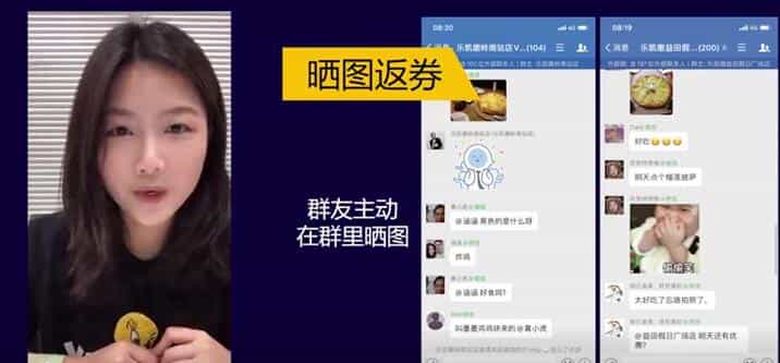 第三、晒图返券:顾客吃披萨的时候,把披萨拍照发微信群,引发群友的兴趣和欲望,可以获得一张20元优惠券。比如其他群友会问“这个黑色的产品是什么?”是个黑色墨鱼汁染色的炸鸡,下次可以点来吃吃看。群互动就自然而然产生了,通过内容吸引群友.
