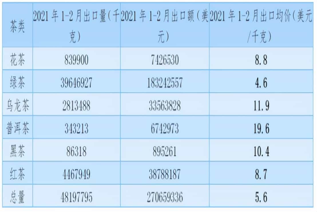 国内的茶叶也不单单只为国人服务,茶文化应该流传于世界各国角落,让所有人都知道中国的好茶,所以国内茶叶的出口量也处于上升趋势。例如2020年茶叶出口量为34.88万吨,相较于2019年来说少了1.77万吨,不过受疫情的影响也是可以理解的。不过从茶的种类来说,普洱茶的出口量最多。