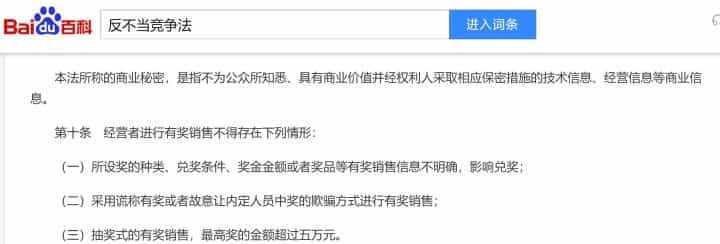为什么商场的商店会把我们引流到那个柜台,是该柜台的个体行为还是商场行为?抽奖是个体行为还是商场行为?抽奖过程是否有欺诈行为?整个消费流程是否有诱骗现象存在?该如何取证?然后针对不同问题我们俩分别上网查资料,结果我在《反不当竞争法》的第十条中看到了曙光!抽奖式的有奖销售,最高奖的金额超过5万元属于违法行为。那这条法律如何解读,因为一开始商家很聪明的说,打折后的消费金额不能超过5万元。于是我再次拨通电话,此时2:00。接线员告诉我,是打折前和打折后的差价不能超过5万元,那么其实商家知道这个5万元的限额,但是他们解读错了,心里稍微松了一口气。于是我们进行了计算,发现我们买的这个玉59,998-10,800,差价小于5万。但是我们马上反应过来,其他商品,比如定价为10万的商品差价必然超过5万,那就是已经构成违法。