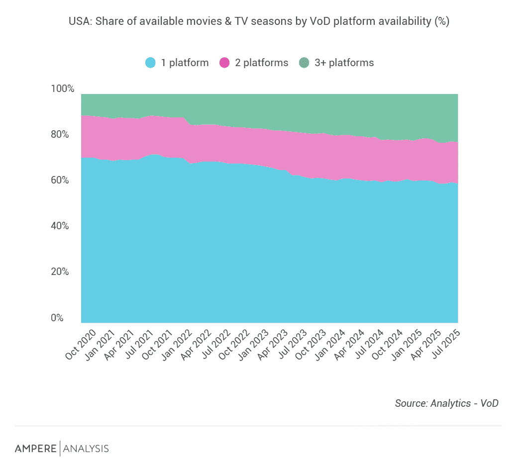事实上,同时可在至少三个不同的美国视频点播平台观看的内容占比已从2020年的9%增长到2025年的21%。