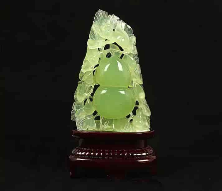 此外有裂隙的岫玉如果经过蜡填充,时间久了或温度高了,蜡渗透出来,表面也会变得干巴巴,并且因蜡的老化发黄,玉石表面像变色了一样。