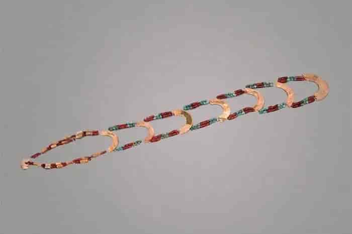 1991年,西周七璜联珠组玉佩出土于河南省三门峡虢国M2001号墓,现收藏于河南博物院。整组玉佩结构复杂、组合规整、饰纹精湛,通长约87厘米,以七件由上到下,由小到大依次递增的玉璜组合而成,各个玉璜之间均以左右对称、双排两行的玛瑙与琉璃串珠连缀而成。此组玉佩作为西周时期佩玉的经典形象,充分反映了当朝时代的佩玉制度,代表着西周贵族的佩玉风格,后来这习俗的影响一直延至春秋、战国,以至于玉璜总能在众多古代玉器中能拥有尤其突出的地位。
