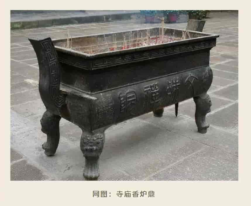 秦代以后,青铜鼎逐渐褪去了王权象征的意义。此后,伴随着我国佛教的传播与盛行,青铜鼎也由此演变成一种重要的祭祀神灵礼器。时至今日,我们总能看到安放于寺庙大殿前的青铜鼎,既是一种祭祀的礼器,亦是一种焚香的容器。