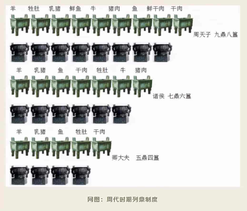 周朝时期,有一种成组的鼎,形制由大到小组为一列,古人称之为“列鼎”,其数目是当时各种身份等级的代表,更是奴隶主身份等级差别的标志之一,且通常为单数。正所谓“天子九鼎、诸侯七鼎、卿大夫五鼎、元士三鼎”,不同等级、身份、地位所使用“鼎”的数量均有严格规定。