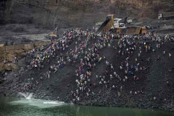 就是矿主挖完,经过几轮筛选之后,会把剩余的成吨废渣,往废渣山里面直接倾倒,然后一帮缅甸人蜂拥而上。