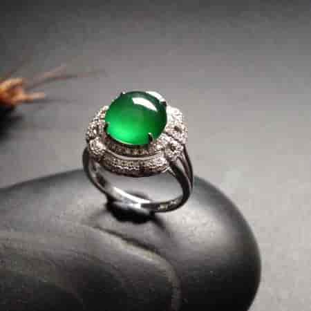上图:多种颜色的翡翠戒面,使用不同颜色的18K金镶嵌,相得益彰
