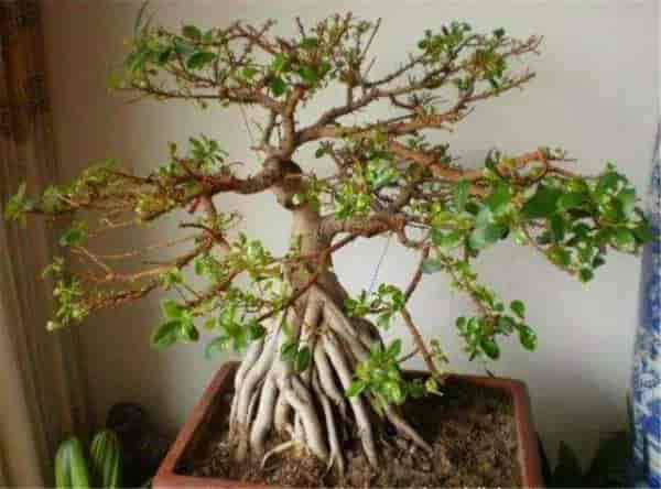 选取健壮易发新根的树种,用一个深的签筒盆,底部填放一层肥土,上面放人河沙,然后栽人植株,诱引根系向底部肥土伸展。每隔一段时期取出部分河沙,使根系逐渐裸露,最后将植株连底部肥土一起上盆,把侧根向四周扩张,并隆起盆面,再用塑料绳绑扎固定在盆上(定型后剪掉)多接触阳光风雨,促使根的老化。