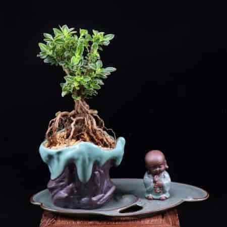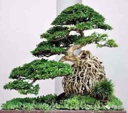 为了增加树桩盆景的艺术价值和欣赏情趣,对一般树根都要进行提根处理,使其基部显露一部分造型有力、稳健的根部在盆的表面,给人以苍古雄奇的审美意境。一株树桩盆景,不论是苍老虬枝的桩头,还是小巧玲珑的微型盆栽,干基盘根错节,才更显苍劲古朴、自然而奇特。