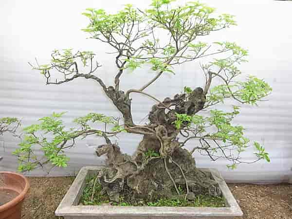 黄荆的“养胚”可用纯砂土,也可用腐殖土混合沙土进行栽培,从实际经验来看,建议采取“浅栽高围”的方式进行养护,这样,既可以提高成活率,又可以节省养胚上盆步骤,还可以为逐步提根露爪打下基础。上盆前,首先对素材进行修剪整理,修剪时要因材取势,仔细审视,确定盆景大致造型模式,然后保留有用枝条,去除过密枝和无用枝,不保留叶片;对根部处理时,剪除伤根和过长的根,尽量保留须根和毛细根,并注意剪口的平滑,然后涂抹愈合剂或者硫磺粉处理剪口。黄荆若是下山很快上盆,完全不必用生根粉或者清水浸泡,若是时间过长,就需要用清水浸泡,或适当添加生根粉,一般浸泡半个小时即可,脱水严重适当延长浸泡时间。