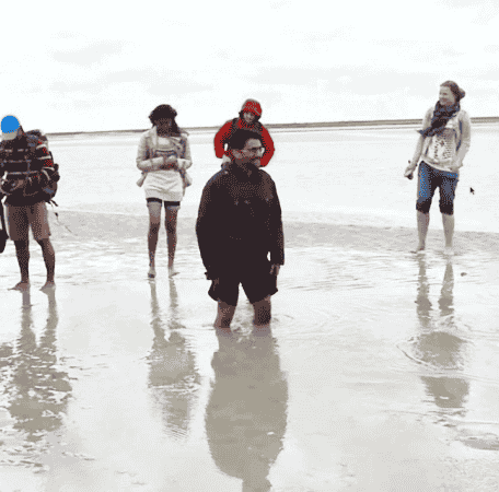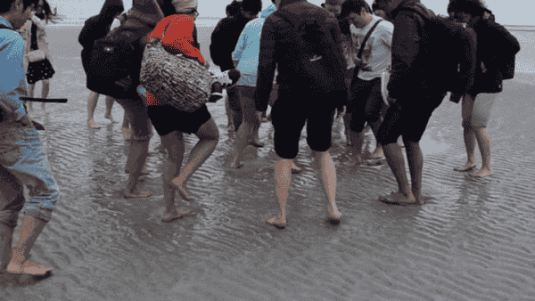 踩踏沙滩,将其变成泥浆的过程 图源:Youtube Linh Nguyen
