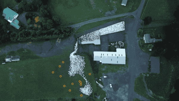 这张无人机拍摄的图片里有上千只绵羊(白色的点),但管理这个庞大羊群的牧羊犬却只有十几只(黄色圆圈)。十几只牧羊犬通过分工合作,依靠不断的缩小包围圈,就可以把上千只羊赶入羊圈。